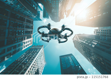 青空の下_高層ビルの隙間を飛ぶ空飛ぶクルマ2