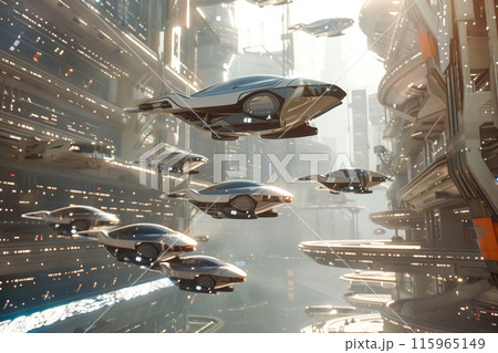 大都市のビルの隙間を飛ぶ複数の空飛ぶクルマ1