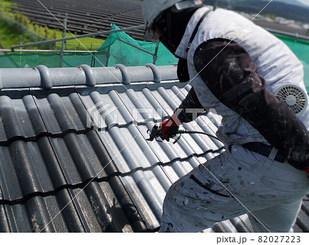 エアレス塗装機を用いて屋根瓦の上塗り塗装を行う男性塗装職人