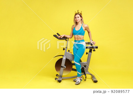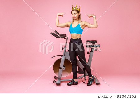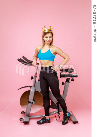 Full length of athletic woman in golden crown, queen of sports trainings, standing with hand on hips near bike simulator, wearing sports tights and top. Indoor studio shot isolated on pink background.