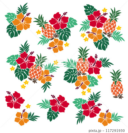 ハイビスカスとパイナップルのアロハ素材,