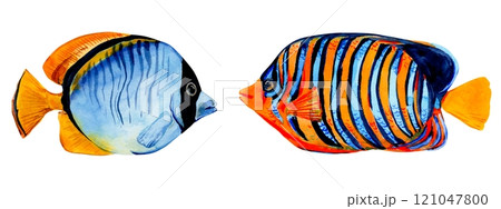 Tropical fish on a white background. Bright inhabitants of coral reefs. Pygoplites diacanthus fish. Watercolor illustration for summer design.