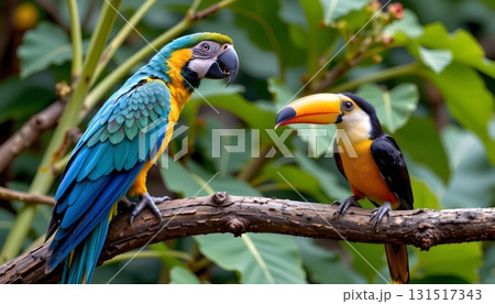 Exotic, tropical birds and rainforest colorful illustration. Generative AI