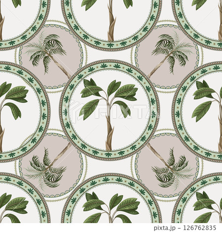 Seamless pattern with ornamental circle and palm trees. Vector.