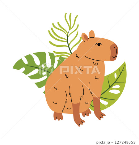 Cartoon flat style capybara surrounded by tropical leaf composition.