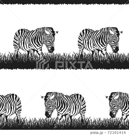 Seamless pattern of graphical sketch Zebra stands in the grass isolated on white background, vector illustration