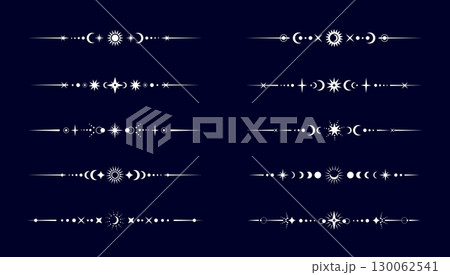 Esoteric mystic celestial divider borders vector set. Fantasy, space or magic golden lines with glowing mystical sun, crescent moon and star boho symbols. Astrology, wicca, witchcraft spiritual frames