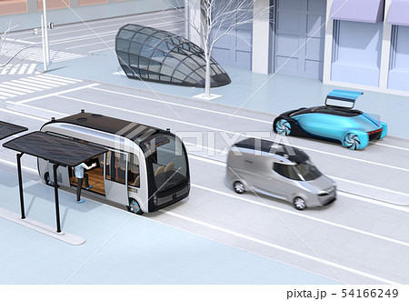 バス停に男性が自動運転バスに乗り込む。道路の反対側にライドシェアEVが停車している