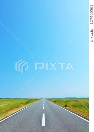 青空の地平線に向かって延びる一直線の開放的な道