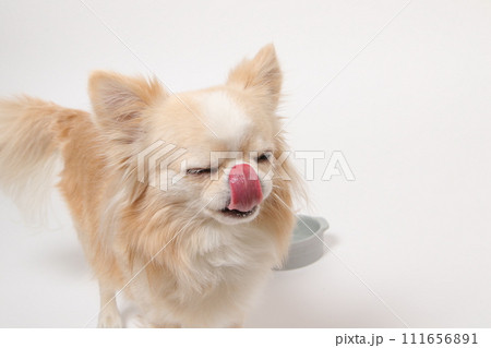 食後ずっとフードボールを舐めたり、もっと欲しいと舌なめずりする小型犬のチワワ