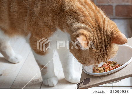 エサ台からご飯を食べる茶白猫