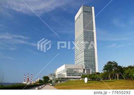 リバーフロントパークか見上げた朱鷺メッセ 万代島ビル