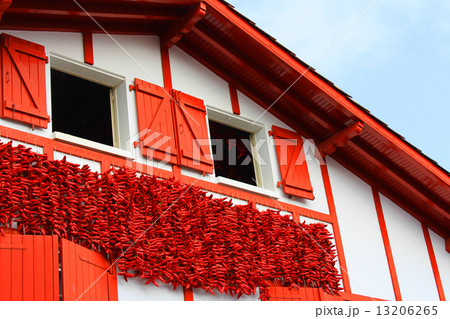フレンチバスク地方の唐辛子で有名なエスプレット村の唐辛子の飾りが付いた赤と白の建物