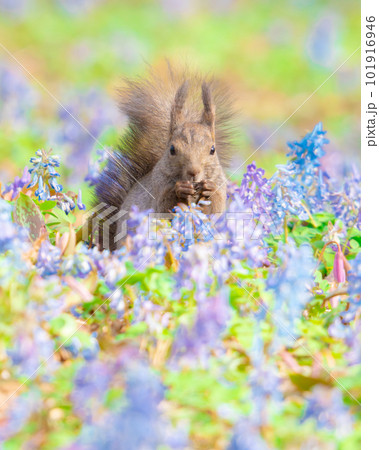 北海道浦臼神社のエゾエンゴサクとカタクリの花畑で食事をするエゾリス
