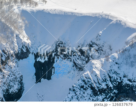 青く輝くフレペの滝 (空撮、エゾシカ・観光客の姿が見える)