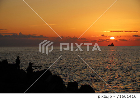 三国サンセットビーチの夕暮れ(福井県 坂井市 三国町 シルエット)
