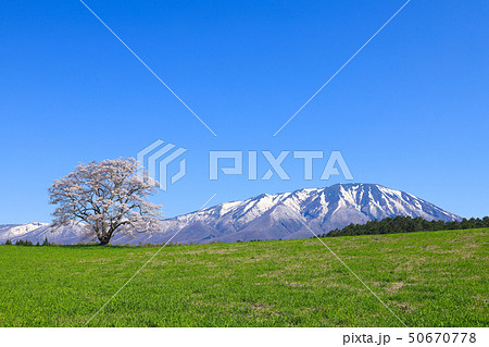 「岩手県」満開の一本桜と岩手山
