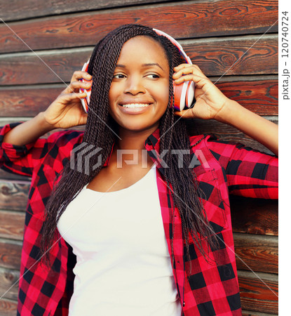 Fashion portrait happy smiling young african woman in headphones is enjoying listens to music