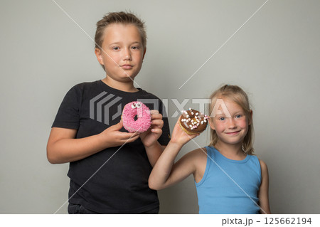 Portrait of children holding chocolate glazed donut indoor. Happy kids with sweet food portrait