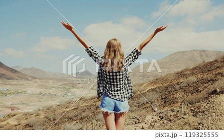 Happy woman raises hands up on hiking trail on top of mountain, Tenerife, Canary Islands, Spain