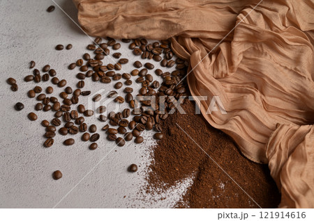 Fresh aromatic grain and ground coffee, white background, brown cloth