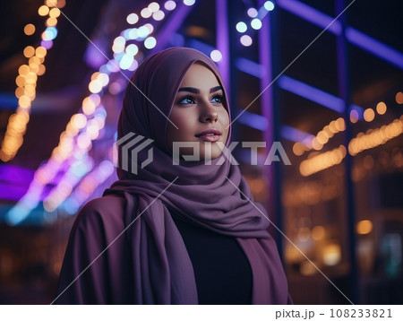 portrait hijab young woman, amazed happy arabian asian muslim woman in abaya hijab, Close-up portrait of attractive cheery modest muslimah. AI Generative.