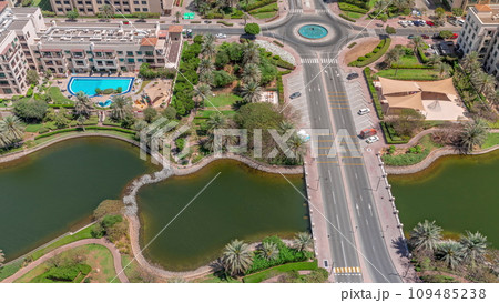 Pond with bridge and low rise buildings in Greens district aerial timelapse. Dubai skyline
