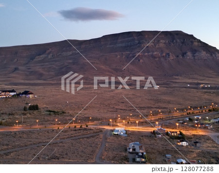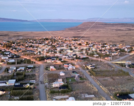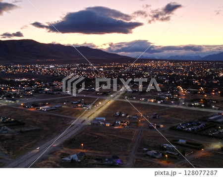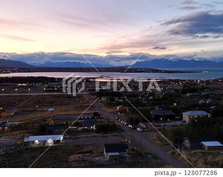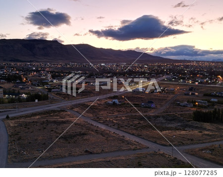 アルゼンチンのエルカラファテの町の夕暮れ時の空撮