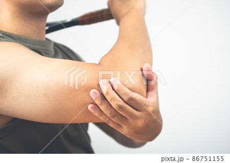 Tennis elbow injury concept. The man holds racket. Healthcare knowledge. Medium close up shot.