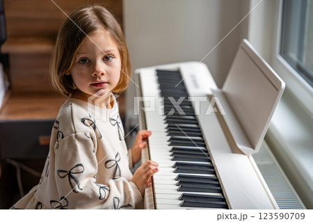 Home lesson on music for the girl on white piano synthesizer. Concept of early development: learning music enhances motor skills, hearing, and intelligence, fostering creativity from childhood