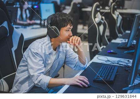 ゲーミングチェアでゲームに没頭する男子学生の後ろ姿