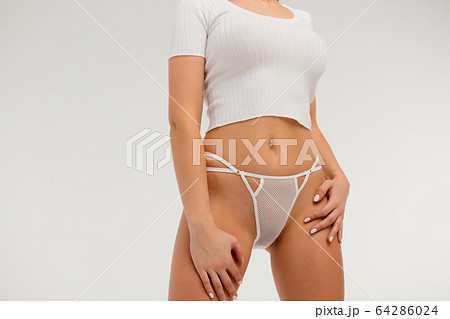 Faceless gorgeous woman with hands on thighs