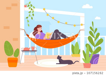 Woman in hammock on balcony. Girl reading book relaxing at home terrace with green flowers plant, summer holiday vacation veranda house interior sky background vector illustration