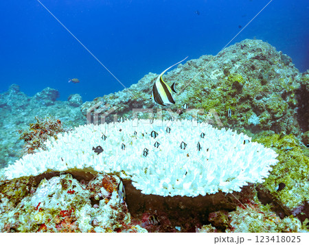 白化現象した美しいテーブルサンゴとホシゴンベの幼魚 静岡県伊豆半島賀茂郡南伊豆町中木ヒリゾ浜2024