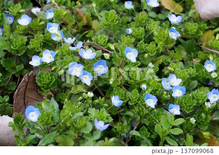 春の花壇に咲くオオイヌノフグリの青い花