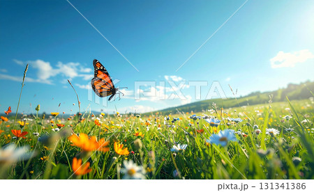 広がる青空と光の中で舞う蝶と咲き乱れる野花