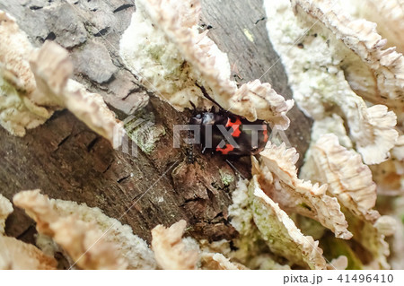 黒地にオレンジ色の紋様が甲冑のようなクヌギの朽木裏で越冬するヒメオビオオキノコ(ストロボマクロ撮影)