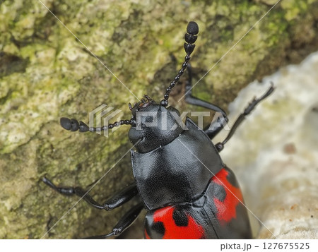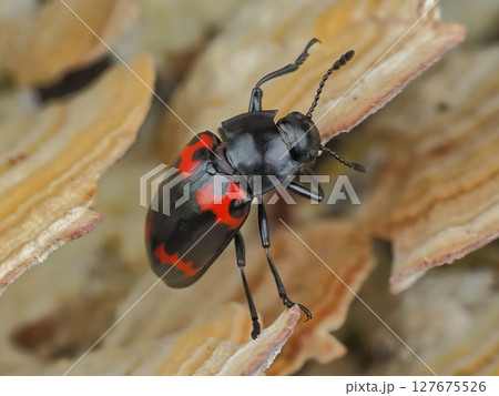 生き物 昆虫 ヒメオビオオキノコ、上下二列の赤い模様。下は波形で上は人型?巴紋型?