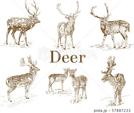 Nature objects. Vintage engraving. Hand drawn, doodle graphic with deer. Set of animals. Nature