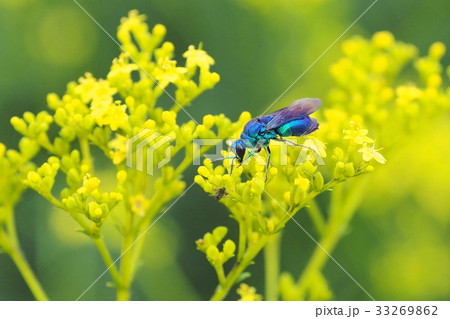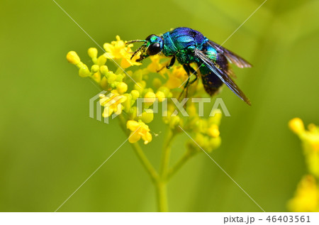 幸せを呼ぶ青い蜂 オミナエシで吸蜜するセイボウ科オオセイボウ