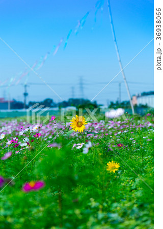 秋晴れの青空に映えるコスモス畑[愛知県幸田町]
