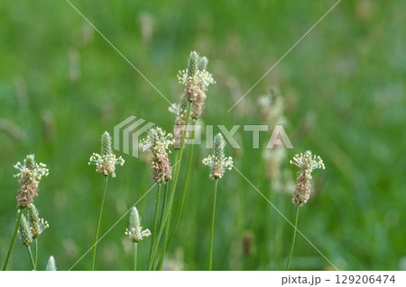 オオバコの花のクローズアップ(公園の広場のスモトリグサ)