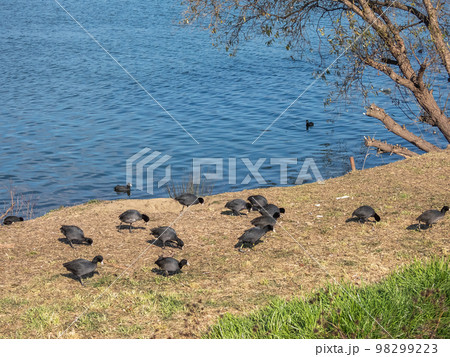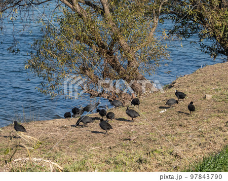 川岸のオオバンの群れ