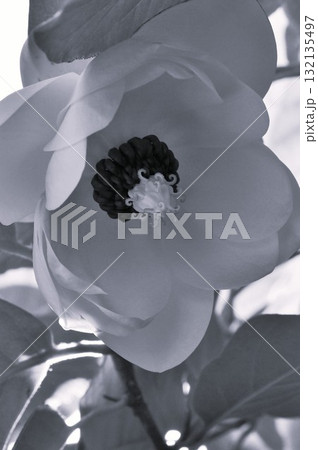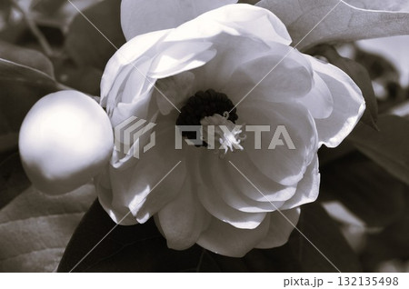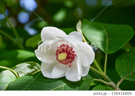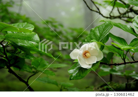 オオバオオヤマレンゲの大きな白い花咲く森の風景(自然光・接写写真)