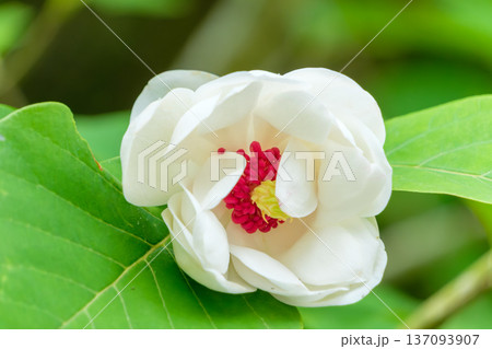 白い花びらと赤い芯のコントラストが際立つオオヤマレンゲ