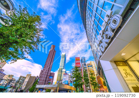 日本の東京都市景観 10月。新宿駅東口前。西武新宿駅や東急歌舞伎町タワーなどを望む=7日