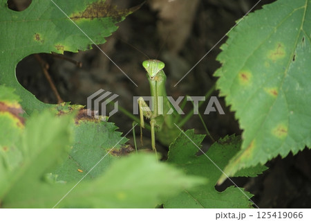 唯一の武器である鎌状の脚を隠し、戦闘態勢のオオカマキリ