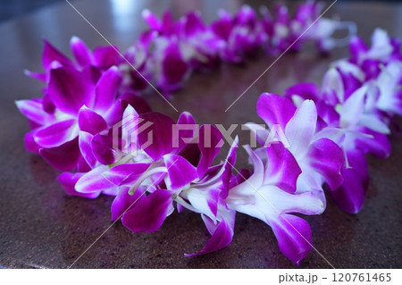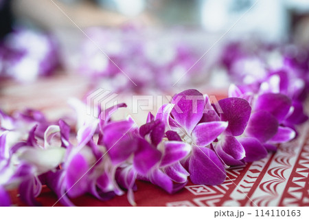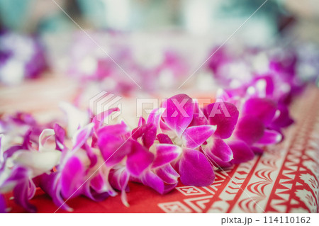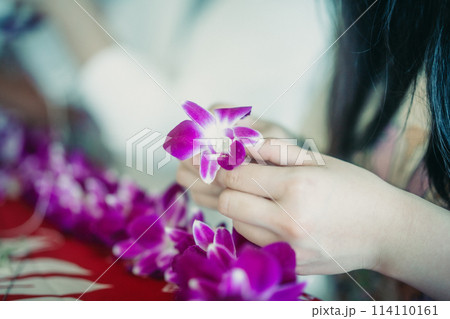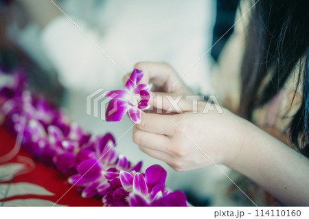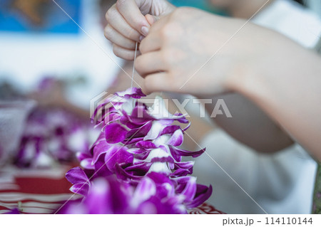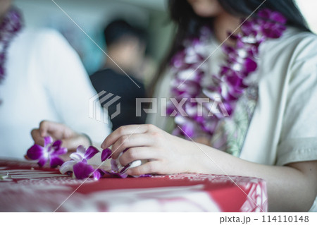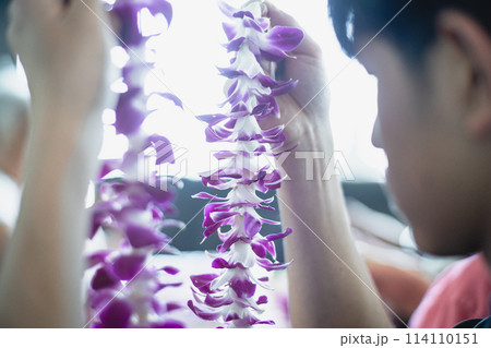 ハワイ、ワイキキにて蘭のレイ作りを体験する若者
