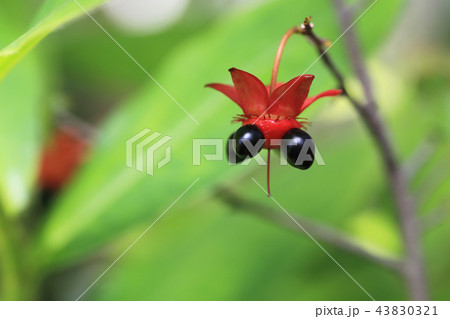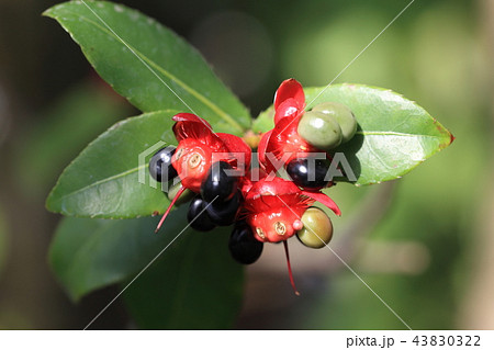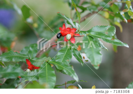 南アフリカ原産の赤い萼片の中に黒色の果実が魅力的なミッキーマウスノキ