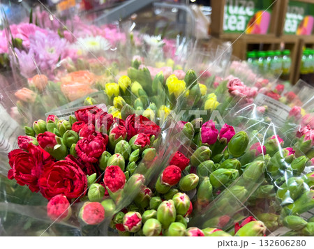 Vibrant bouquets of fresh carnations, featuring red, pink, and yellow blooms along with green buds, displayed for retail sale in a bustling supermarket